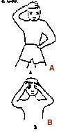 Tay trái chống nạnh, tay mặt xòe ra để lên mõ ác Nê hường cung, rồi xoay vòng tròn trên mỏ ác 12 vòng, chạy từ phía trái ra phía phải theo chiều kim đồng hồ. Vì làm việc bằng trí nhiều, dùng phương pháp này để bổ thần kinh. A. Tư thế này lúc thực hiện có thể dùng ghế ngồi thoải mái. B. Vổ đều khắp trán, tư thế này có thể ngồi ghế.